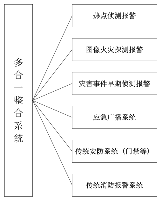 如圖所示,在變電站內部署一套多合一整合系統管理平臺,前端設備都通過網絡接入管理平臺,包括熱點偵測模塊、多頻圖像火災探測器、智能跟蹤球機、監聽與應急廣播、傳統安防系統、傳統火災報警系統;其中多頻圖像火災探測器采用分布式探測技術,輸出火災報警信號的同時,也能輸出傳統模擬視頻信號,再通過智能視頻編碼單元接入網絡;智能跟蹤球機通過與之配套的智能視頻編碼單元接入網絡,智能球機在沒有被控制的時候回到初始預置位,能夠實現智能偵測報警,報警后能聯動跟蹤報警目標;監聽與應急廣播系統不僅可以作為日常宣傳安全生產所用,報警發生后作為應急指揮的有效手段;傳統的消防系統如門禁系統等也能直接接入該管理平臺;傳統的消防系統如煙感、手報、滅火控制系統接入該平臺,能實現報警后的聯動響應;自尋的消防炮滅火系統根據需要選擇。