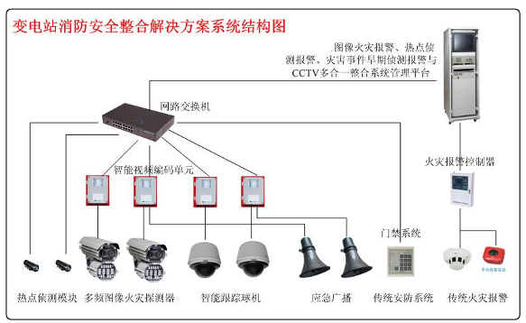 針對變電站消防安全急需解決的問題,我們采用熱點偵測模塊、多頻圖像火災探測器、智能跟蹤球機、智能視頻編碼器、電纜隧道感溫電纜報警器、監聽與應急廣播、自尋的消防炮(可選),以及與傳統的安防系統和消防系統、電力自動化系統進行融合,將能有效的解決變電站所有的消防安全問題。