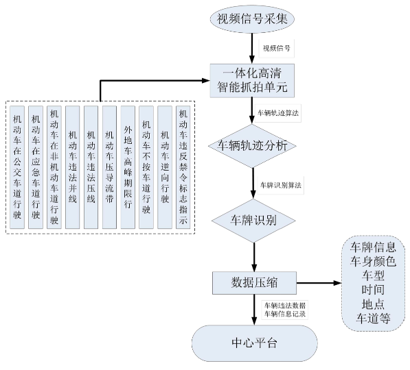 違法自動檢測:違法抓拍單元內置具有車輛違法檢測、識別,可對多種違法行為進行檢測和記錄,同時具備通行車輛抓拍和記錄、全天視頻監控錄像、交通參數采集等多種復合功能。