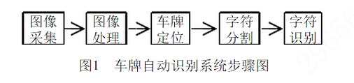 車牌識別技術是基于圖像分割和圖像識別理論,對含有車輛號牌的圖像進行分析處理,從而確定牌照在圖像中的位置,并進一步提取和識別出文本字符。識別步驟概括為:圖像采集、圖像處理、車牌定位、字符分割、字符識別(見圖1)。