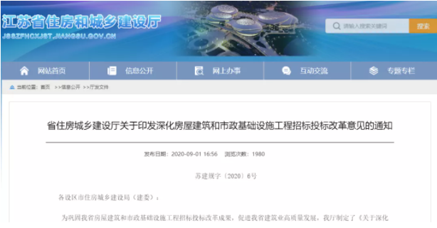 近日,江蘇省住建廳印發(fā)《深化房屋建筑和市政基礎(chǔ)設(shè)施工程招標(biāo)投標(biāo)改革意見》,自2020年10月1日起施行