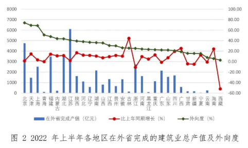 廣西、海南的增幅也超過了20%。7個地區(qū)在外省完成的建筑業(yè)總產值出現(xiàn)負增長,其中西藏的負增長超過50%,浙江的負增長超過10%。從外向度(即本地區(qū)在外省完成的產值占本地區(qū)建筑業(yè)總產值的比例)來看,排在前三位的地區(qū)是仍然北京、天津和上海,分別為74.0%、69.1%和68.3%。外向度超過30%的還有青海、福建、內蒙古、湖北、江蘇、陜西、河北、遼寧、湖南、山西、江西、貴州等 12 個地區(qū)(圖 2)。