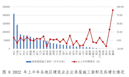 房屋建筑施工面積超過5億平方米的還有廣東、北京、山東、福建、湖北、上海、四川、河南等 8個地區(qū)。房屋建筑施工面積同比增長最快的是西藏,為90.1%。新疆、青海增幅均超過30%。